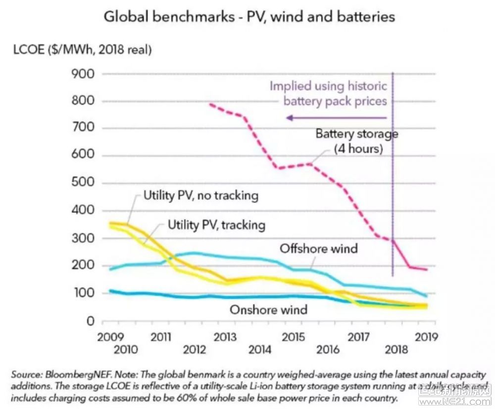 发电的LCOE分别下降10%和18%,分别达到50美元、每兆瓦时57美元(2019年初开工建设的项目)。可见,锂离子电池成本下降幅度超过了太阳能光伏和风电LCOE下降速度。
