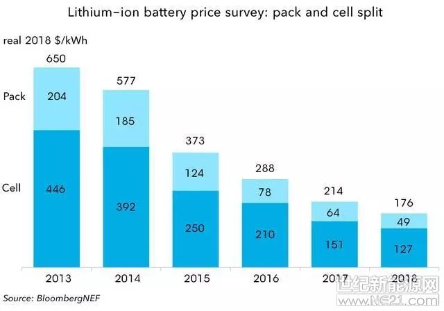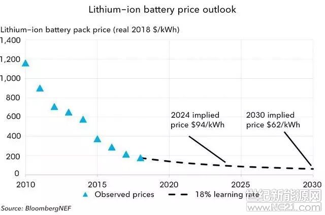 而BNEF新能源储能部负责人Logan Goldie-Scot则于2018年预测,到2024年,锂电池电池组的全球平均价格,将降至每千瓦时94美元。