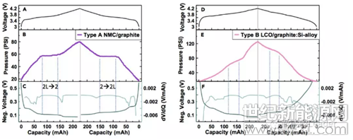 下图A-C为电池A在充放电过程中的压力变化,下图D-F为电池B在充放电过程中的压力变化,从图中能够看到在充电的过程中随着负极嵌锂体积发生膨胀,因此充电的过程中电池整体压力上升,在放电的过程中电池的压力则相应的下降。从下图b我们能够看到石墨负极在2L-2区域内体积几乎没有发生变化,因此电池的压力也出现了一个平台期。但是在电池B中由于负极中加入了Si合金,因此我们发现在这一压力变化平台区消失了,这主要是由于Si负极的体积膨胀远大于石墨,因此石墨在这一区域的平台期被Si合金的体积膨胀所抵消。