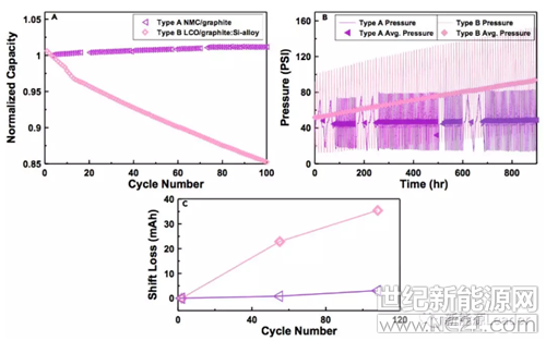 下图A为A和B两种电池的循环性能曲线,从图中可以看到循环100次后A电池的可逆容量几乎没有衰降,而掺入Si合金的B电池容量发生了大幅的衰降。下图B为两种电池随时间的压力变化情况,从图中能够看到电池A在循环过程中充放电过程中压力变化非常平稳,不可逆的压力增长非常小,而电池B在循环过程中则出现了非常大的不可逆压力增长。不可逆压力的持续增加通常是由于电极体积的持续增加导致,下图C分析了两种电池由于活性Li损失导致的不可逆容量损失,从图中能够看到电池A在循环中可逆容量损失非常小,而电池B在循环中活性Li的损失则在持续增加,活性Li的损失通常是由于负极SEI膜的持续增长导致的,持续增长的SEI膜会导致负极不断变厚,而这也与B电池的不可逆压力持续增加的现象一致。