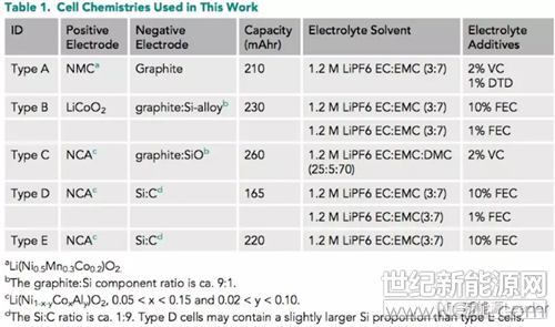实验中A.J. Louli采用的电池为402035(40mm×20mm×3.5mm)软包结构电池,几种电池的材料体系如下表所示,正极分别采用了NCM、LCO和NCA,负极则分别采用了石墨、石墨+Si合金、石墨+SiO和Si:C体系,其中D和E虽然体系相同但是E的涂布量更大一些。