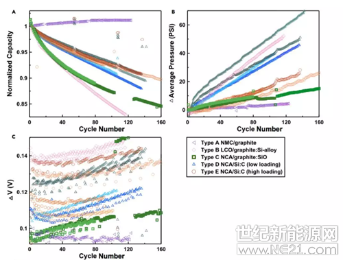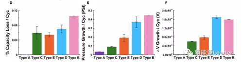 下图A为几种电池的循环性能曲线,从图中能够到负极不含Si的电池A循环性能表现最好,几乎没有发生容量衰降。含有SiO的电池虽然初期的循环性能较差,但是在后续的长期循环性能测试中表现要明显好于其他几种含硅电池(在作者提供的附加信息中),电池D和E在初期的循环性能比较接近,但是在后续的循环测试中电池E的表现要好于电池D,而电池B在循环中的性能表现最差。因此几种电池的循环性能从好到坏的顺序分别为A>C>E>D>B。我们在观察几种电池在循环过程中的不可逆压力变化(下图B),从图中能够看到电池A在循环过程中不可逆压力增加最少,其次为电池C,然后是电池E,然后电池D,增加最快的为电池B,这与电池的循环性能完全一致。