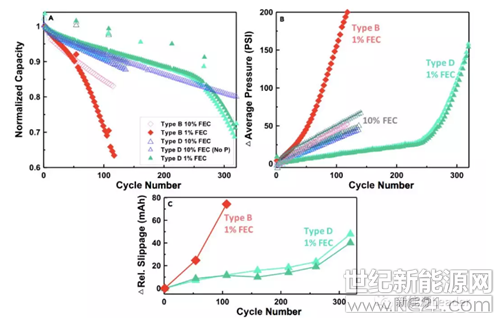 Si负极在循环过程中体积膨胀比较大,对SEI膜的稳定性提出了比较高的要求,众多的研究表明电解液中添加部分FEC能够很好的改善含Si负极的循环性能。下图A展示了B和D两种电池分别添加1%和10%FEC后的循环性能,从图中能够看到添加1%FEC的B电池在循环50次后开始出现跳水,而添加10%FEC的B电池在循环100次后仍然没有出现突然的容量跳水。添加1%FEC的电池D在循环250次后容量开始出现跳水,但是添加10%FEC的电池D循环超过300次后仍然没有出现显著的容量跳水,这主要是由于添加FEC较少的电池在FEC添加剂逐渐消耗完后不能有效的阻止电解液的分解,因此导致电解液在负极表面的快速分解,消耗有限的活性Li。下图B则展示了几种电池循环过程中压力的变化,可以看到添加1%FEC的电池B和D分别在各自容量开始出现跳水的循环次数压力也呈现出指数型增长,而添加10%FEC的电池在循环过程中压力增加则相对比较平缓,没有出现突然的快速增长,这也与几种电池的循环表现非常一致。