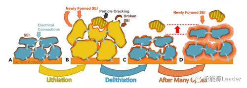 负极SEI膜生长机理如下图所示,在嵌锂的过程中随着嵌锂程度的增加,负极活性物质颗粒会发生相应的体积膨胀(石墨:10%,Si:280%),负极表面的SEI膜由于无法承受如此大的体积膨胀而发生破裂,导致新鲜的活性物质颗粒裸露于电解液中,从而引起电解液的持续分解,导致SEI膜的持续生长变厚,从而引起负极的体积持续膨胀,导致锂离子电池的压力持续增加。
