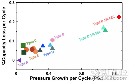 从上面的分析不难看出锂离子电池的可逆容量衰降主要与负极SEI膜的持续增长消耗活性Li有关,而负极SEI膜的持续增长则会导致电池的压力的不断增加,因此锂离子电池的可逆容量衰降与锂离子电池压力增加之间存在很强的线性关系(如下图所示),压力增加快的电池容量衰降也会更多,压力增加慢的电池容量衰降也会相对更慢。
