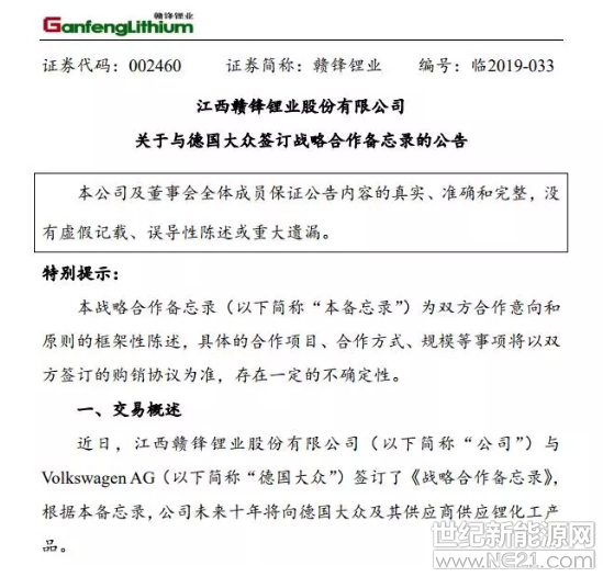 赣锋锂业方面表示,此次与大众建立长期战略合作关系,既满足了德国大众对电池生产的锂关键原材料的需求,又有利于提升公司的持续盈利能力,促进长远发展。本备忘录的签署将对赣锋锂业未来十年的经营业绩有积极影响。