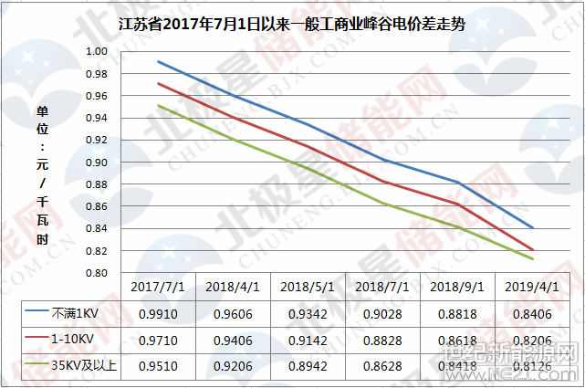 江苏省发改委日前发布了《关于降低一般工商业电价有关事项的通知》,自2019年4月1日起,江苏省一般工商业及其他用电类别电价每千瓦时降低3.1分。且此次变更以后,江苏省峰谷电价又进一步缩小,给储能削峰填谷套利的机会还有多少?