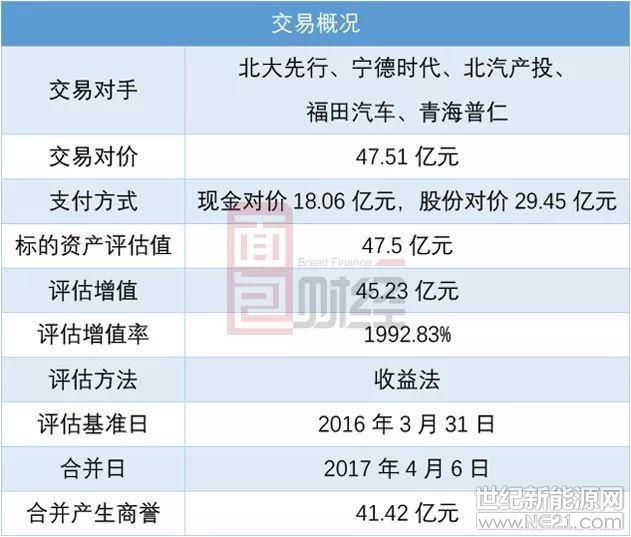 2017年,东方精工以发行股份及支付现金的方式购买北大先行、宁德时代、福田汽车、北汽产投、青海普仁合计持有的普莱德100% 股权,交易对价约47.51亿元。主要交易信息如下表所示: