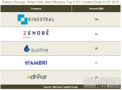 其中,能效企业在2019年第一季度筹集的风险资金为1亿美元。本季度有五位投资者参与了风险投资。