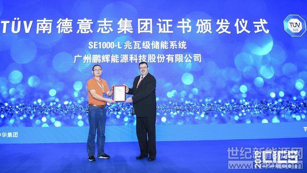 TUV南德全球风险顾问公司常务顾问兼美国储能系统技术委员会主席James Biggins先生(右)为鹏辉能源的产品SE1000-L兆瓦级储能系统颁发TUV南德认证证书