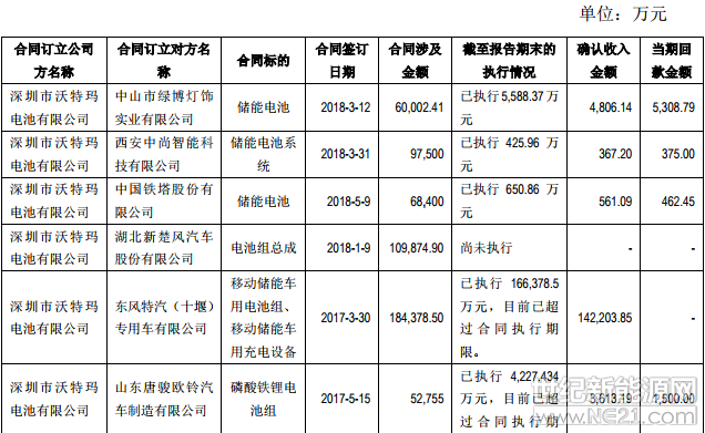 2018 年重大销售合同的执行情况显示,其储能电池主要销售给绿博灯饰、中尚智能、中国铁塔,以及东风特汽的移动储能车等,