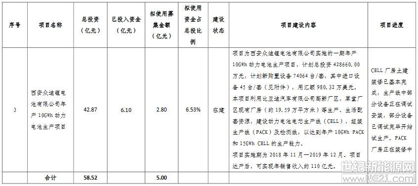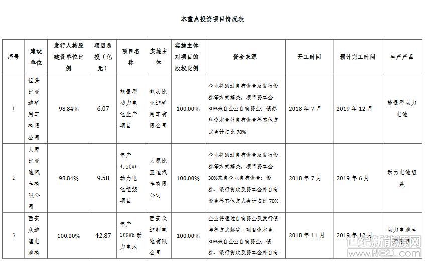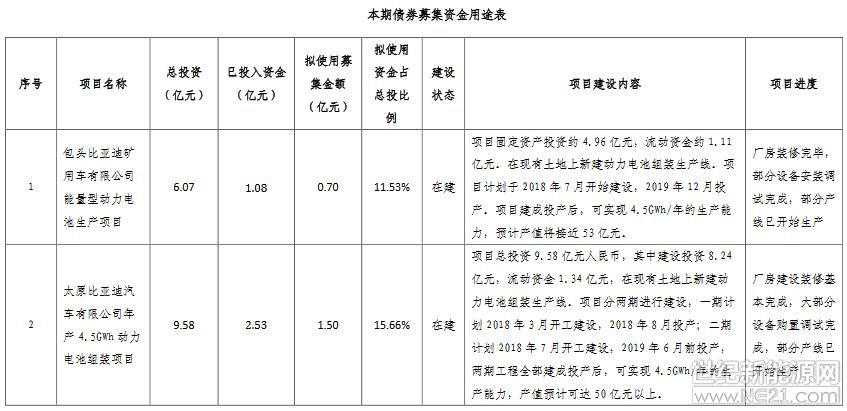 公告中显示,本期债券拟募集资金10亿元,用于项目建设部分,主要拟投往比亚迪新建的若干新能源汽车及零部件、电池及电池材料、城市云轨等绿色产业项目建设,均属于《绿色债券发行指引》范畴,且均具有良好的社会和经济效益。其中,50%的募集资金拟用于包头比亚迪矿用车有限公司能量型动力电池生产项目,太原比亚迪汽车有限公司年产4.5GWh动力电池组装项目和西安众迪锂电池有限公司年产10GWh动力电池生产项目,剩余50%的募集资金拟用于补充公司流动资金。