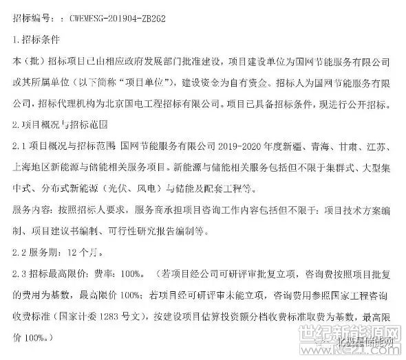 国网节能公司正在进行2019-2020年度新疆、青海、甘肃、江苏、上海地区新能源与储能相关服务项目招标,公告显示招标的新能源与储能相关服务包括但不限于集群式、大型集中式、分布式新能源(