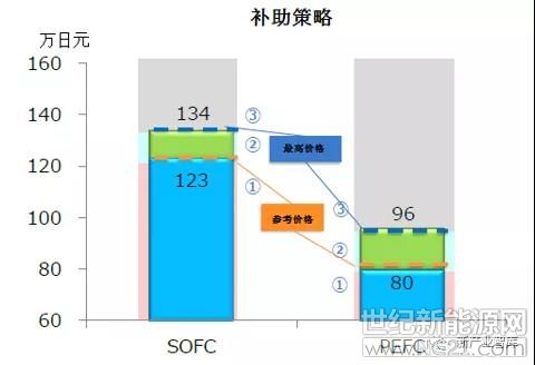 补贴范围:燃料电池设备和安装费用的总价,1)低于参考价格(123万日元,即73800人民币):SOFC补助8万日元(即4800元人民币);2)高于参考价格而低于最高价格(134万日元,即80400人民币):SOFC补助4万日元(即2400元人民币);3)如果超过最高价格,不予补贴;4)PEFC(聚合物电解质燃料电池)没有统一补助标准;5)另外,对可支持液化石油气的设备、可应用在寒冷地区、可用在公寓等环境中的FEMFC和SOFC进行额外补贴。