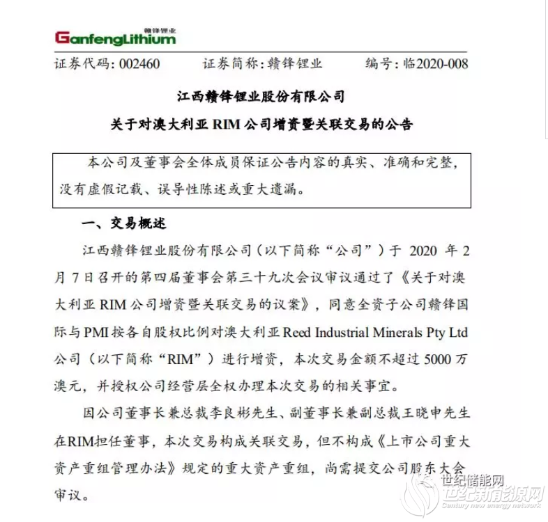 2.江西赣锋锂业股份有限公司(以下简称“公司”)于 2020 年 2 月 7日召开的第四届董事会第三十九次会议审议通过了《关于对澳大利亚 RIM 公司增资暨关联交易的议案》,同意全资子公司赣锋国际与PMI按各自股权比例对澳大利亚Reed Industrial Minerals Pty Ltd公司(以下简称“RIM”)进行增资,本次交易金额不超过 5000 万澳元,并授权公司经营层全权办理本次交易的相关事宜。 因公司董事长兼总裁李良彬先生、副董事长兼副总裁王晓申先生在RIM担任董事,本次交易构成关联交易,但不构成《上市公司重大资产重组管理办法》规定的重大资产重组,尚需提交公司股东大会审议。