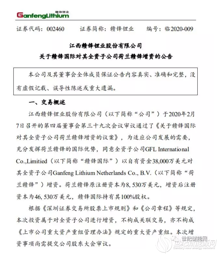 2月8日,江西赣锋锂业股份有限公司发布公告,宣布了关于旗下子公司赣锋国际及孙公司荷兰赣锋对外增资扩股的多项举措。