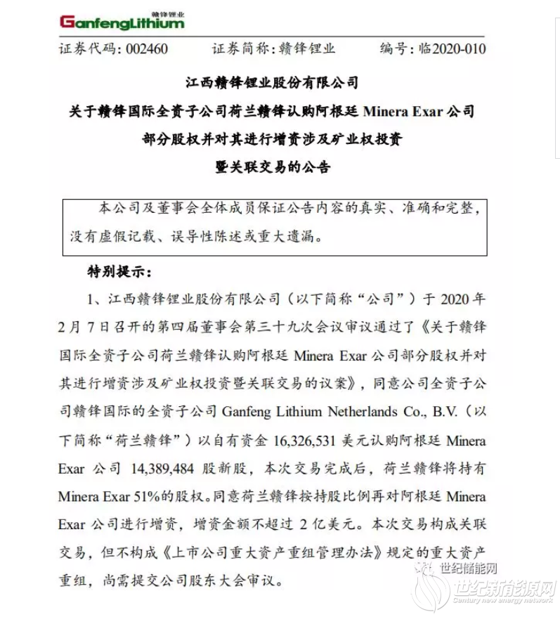 4.江西赣锋锂业股份有限公司(以下简称“公司”)于 2020年2月 7日召开的第四届董事会第三十九次会议审议通过了《关于赣锋国际全资子公司荷兰赣锋认购阿根廷 Minera Exar 公司部分股权并对其进行增资涉及矿业权投资暨关联交易的议案》,同意公司全资子公 司赣锋国际的全资子公司 Ganfeng Lithium Netherlands Co., B.V.(以 下简称“荷兰赣锋”)以自有资金 16,326,531 美元认购阿根廷 MineraExar 公司 14,389,484 股新股,本次交易完成后,荷兰赣锋将持有Minera Exar 51%的股权。同意荷兰赣锋按持股比例再对阿根廷 MineraExar 公司进行增资,增资金额不超过 2 亿美元。本次交易构成关联交易,但不构成《上市公司重大资产重组管理办法》规定的重大资产重组,尚需提交公司股东大会审议。