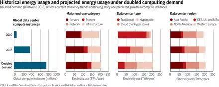 《科学》杂志发表美国西北大学等学者的文章,评估数据中心的电力消耗。2010年至2018年间全球对数据中心服务的需求增长了550%,但同期这些设施的能源使用仅增长了6%。在全球最大的数据中心市场美国,其能源需求实际上在这段时间内趋于平稳——这与21世纪初的情况大相径庭,当时数据中心产出翻番意味着能源需求翻番。