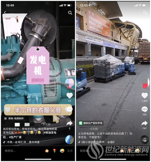 抖音上,有不少商家、工厂发布视频说,“发电机成了衣食父母,半个月温饱就靠它了”、“义乌停电政策,让卖不动的发电机飘了!先拿订金,才能提货!”