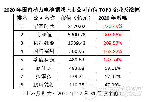 值得注意的是,宁德时代的市值增幅并不是最高的,在电池产业链领域,比亚迪2020年市值增长了307.88%,也是创下新高。同样,在2020年,亿纬锂能、国轩高科、孚能科技等中国动力电池头部企业的市值增幅也均超过一倍。