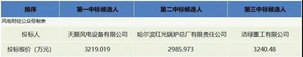 哈尔滨红光锅炉总厂有限责任公司为中标候选人第2名,投标报价为2985.973万元;洁绿重工有限公司为中标候选人第3名,投标报价为3240.48万元。