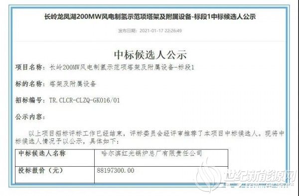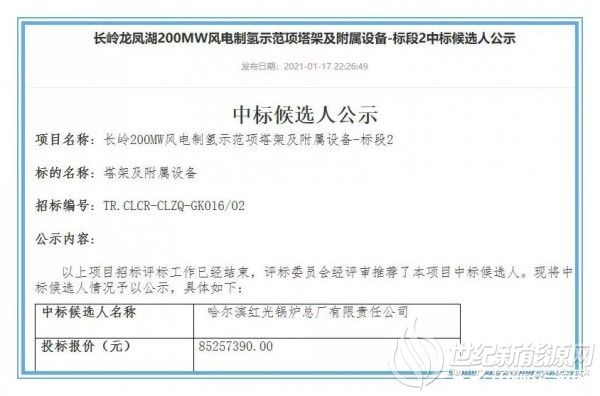 天润公布长岭龙凤湖200MW风电制氢示范项目: