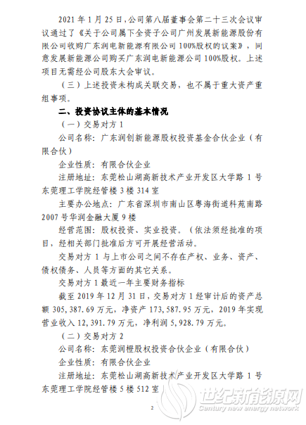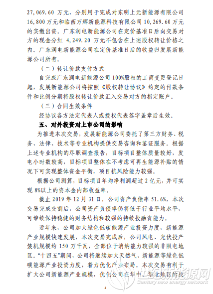 广东润电新能源公司持有位于河南、山东的开封广顺新能源有限公司、东明乾德新能源有限公司、东明景祐新能源有限公司、东明上元新能源有限公司等4个项目公司100%股权,以及持有位于河北的临西县万辉新能源科技有限公司60%股权。上述公司运营风电项目装机容量合计为400MW,均已全容量并网并取得发电业务许可证。