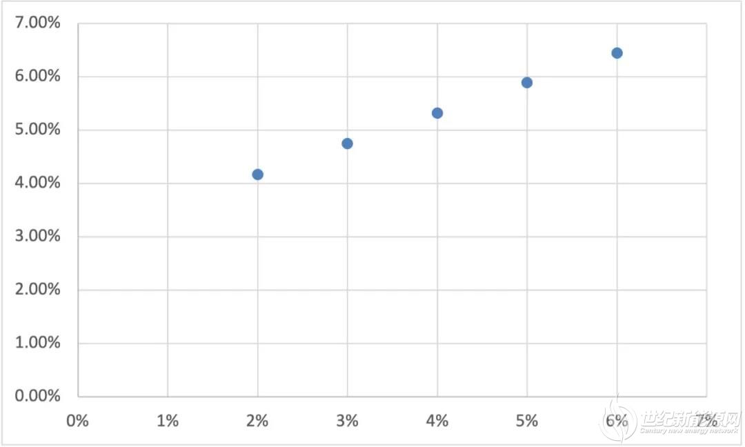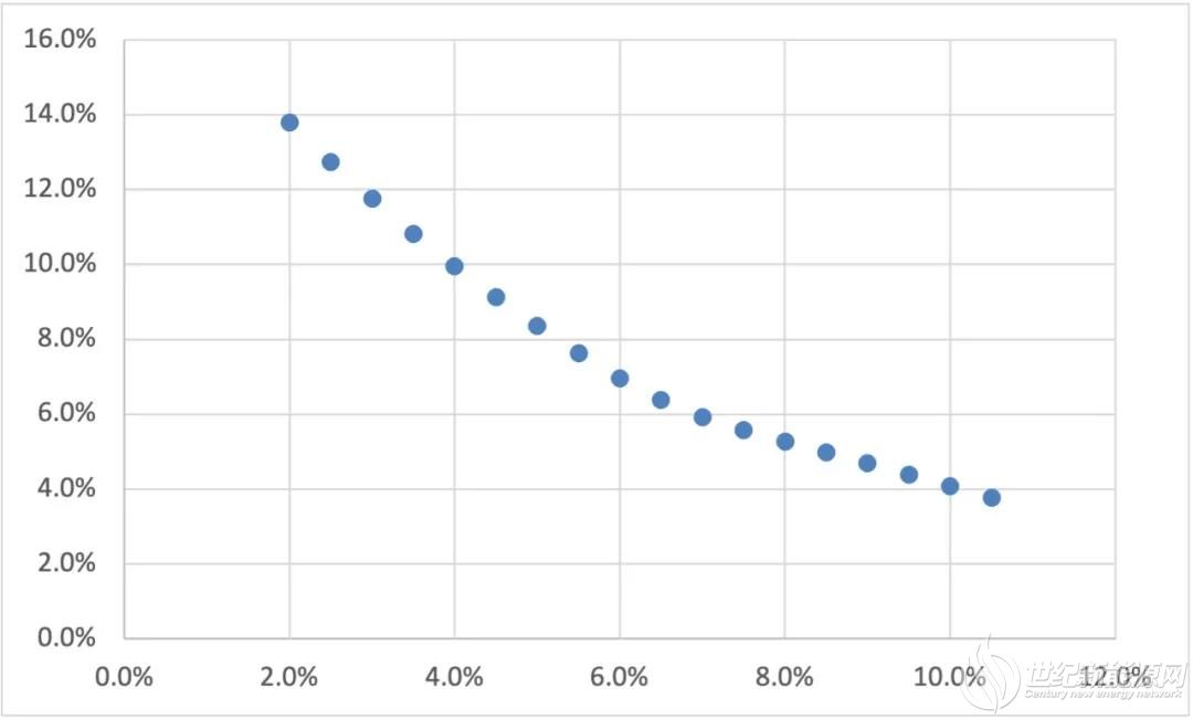 图1 项目IRR6%的情况下不同长期贷款利率(横轴)下股权IRR趋势(纵轴)(假设电价0.28元/kwh,造价6.5元/w,发电2500小时/年,其他为行业常规假设)