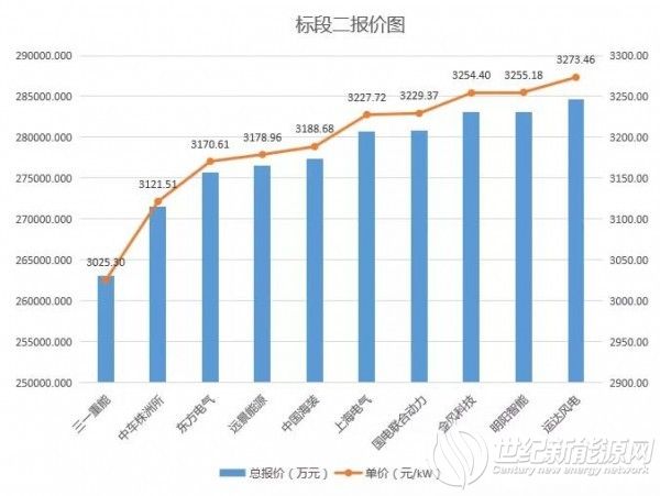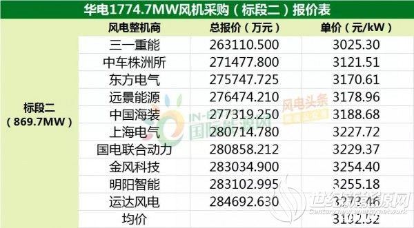 标段二中,十家整机商的报价更为紧凑,其中三一重能的报价在3100元/KW以下;中车株洲所、东方电气、远景能源、中国海装的报价在3100元/kW~3200元/kW之间;上海电气、国电联合动力、金风科技、明阳智能、运达风电的报价均在3200元/kW以上。十家整机商投标均价为3192.52元/kW。