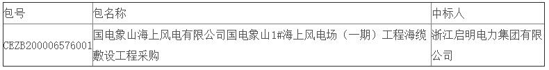 中国神华国际工程有限公司受国电象山海上风电有限公司的委托,就国电电力国电象山海上风电有限公司象山1#海上风电场(一期)工程海缆敷设工程公开招标(招标编号:CEZB200006576)项目进行公开招标,按规定程序进行了评标、定标,现就本次招标的中标结果公告如下: