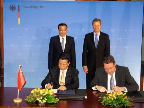1月7日,正在对德国进行国事访问的国务院副总理李克强与德国副总理兼外长韦斯特韦勒共同出席了两国有关合作文件签字仪式。在李克强与韦斯特韦勒的见证下,中广核集团与德国太阳千年股份有限公司(以下简称“千年公司”)签署了关于太阳能热发电项目合作的谅解备忘录。中广核集团公司副总经理谭建生代表集团在备忘录上签字。
