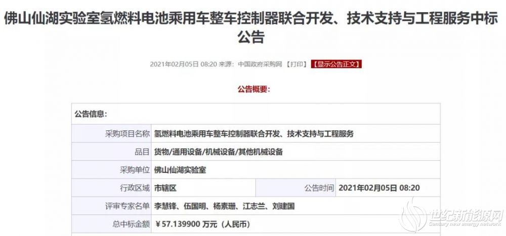 ,2月5日,佛山仙湖实验室发布公告,武汉理工通宇新源动力有限公司中标佛山仙湖实验室氢燃料电池乘用车整车控制器联合开发、技术支持与工程服务项目,成交金额57万元。