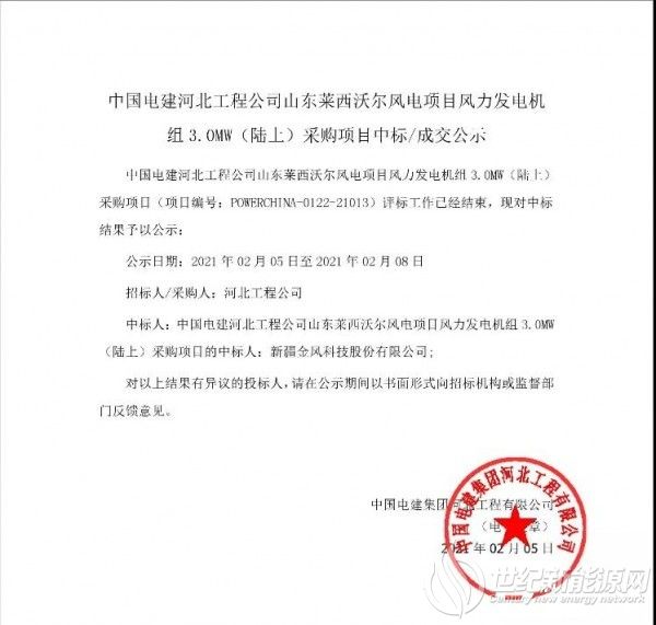 金风科技中标中国电建河北工程公司山东莱西沃尔风电项目风力发电机组采购项目,该项目要求单机规模在3.0MW。