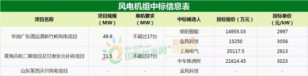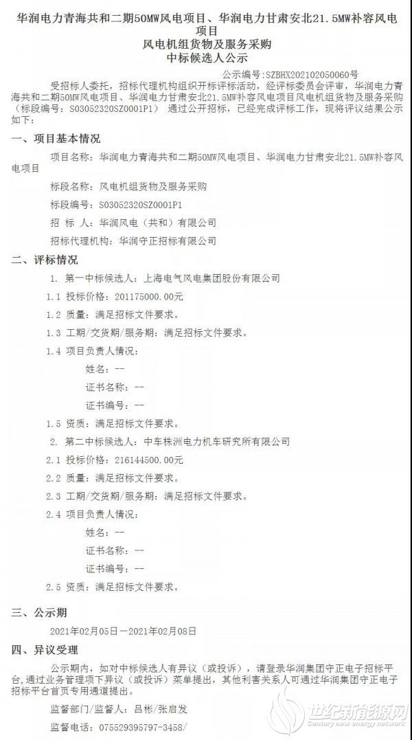 上海电气预中标华润电力青海共和二期50MW风电项目、华润电力甘肃安北21.5MW补容风电项目,装机规模为71.5MW,中标价为20117.5万元,单价为2813元/kW;