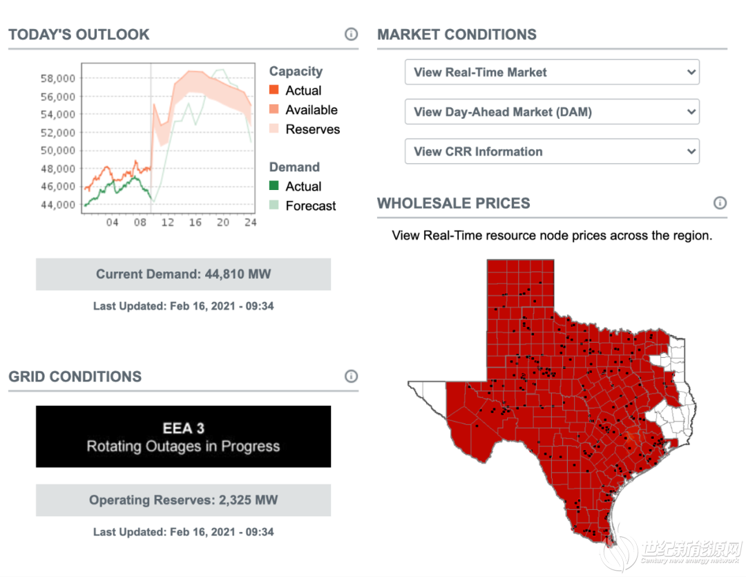 寒潮当然是电荒的客观原因,ERCOT在2月11号发布的新闻就预计,由于遭遇带来数十年来最冷的天气,德州的电力需求量将创历史新高。德州的电力市场化程度很高,点击/就可以看到当日实时的电力需求和预测、以及各地区的电力批发价格。注意电力批发价格是发电厂提供给电力零售商的价格,之后再由零售商销售给消费者。