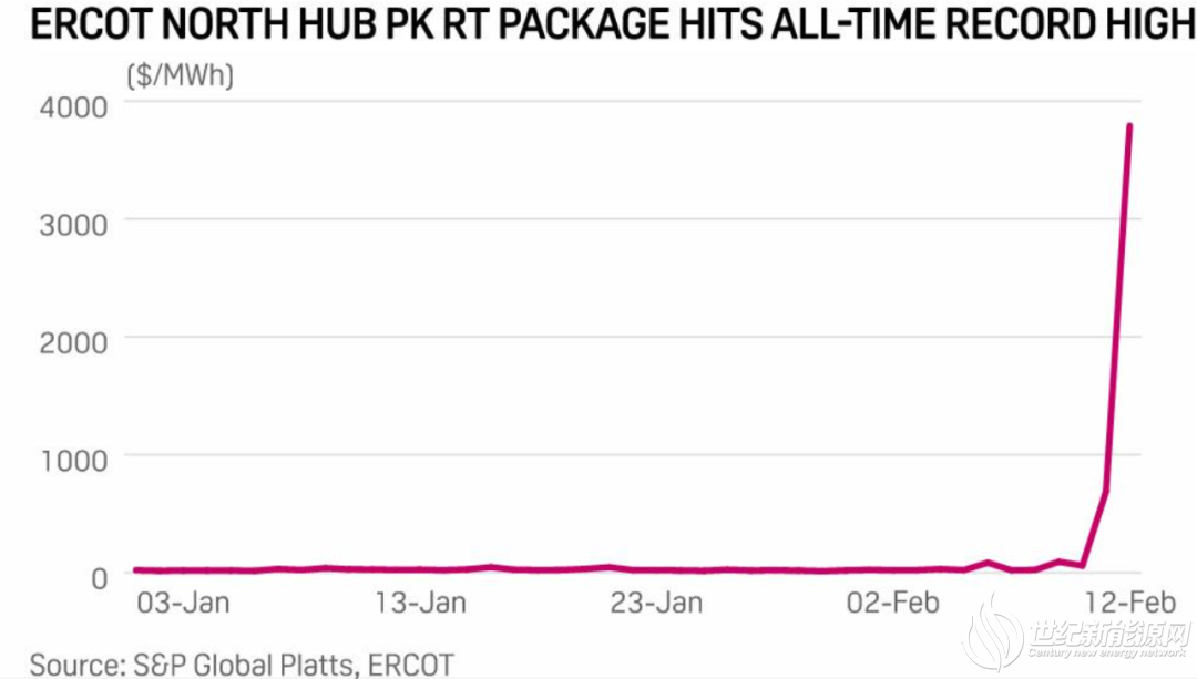 从上周末开始,德州的批发电力价格就开始暴涨。下图是ERCOT批发电力价格的从1月到上周末的走势图,可以看到收到寒潮影响,电价飙升了一百倍。