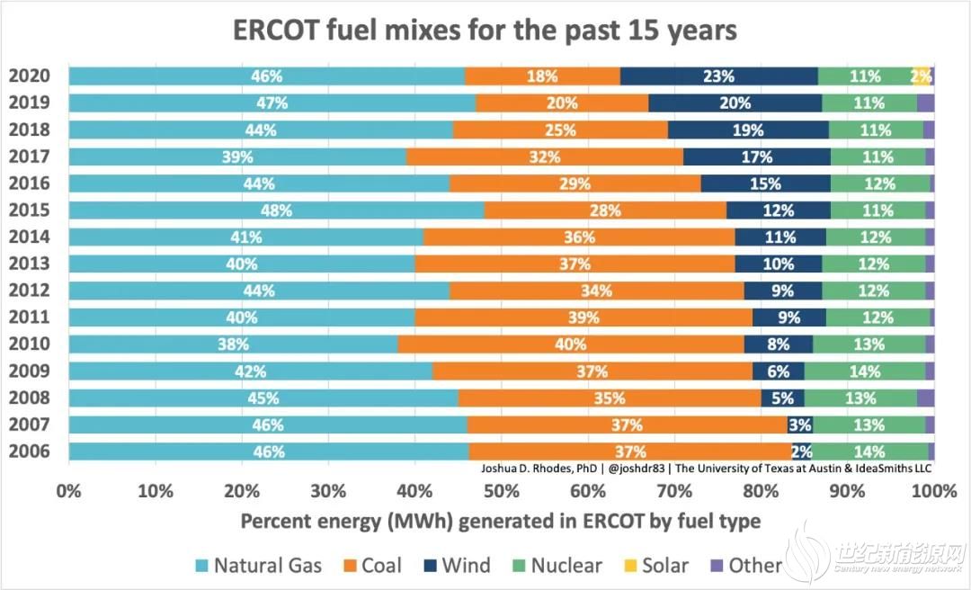 从整体来看,ERCOT已经预计到风电可能会有4-5GW的不能运行,但是没有预计到火电设备的问题,所以这次电荒不应该归咎于风电自身。但是德州的电网现在的风电发电占比大概在23%左右(如下图),如果风电占比进一步提高,而火电占比进一步下降,会不会就有风险?