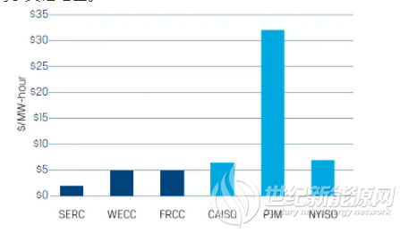 注:SERC、WECC、FRCC为北美可靠性管理委员会下属的区域可靠性委员会管辖的垂直一体化地区,储能调频收益基于固定价格确定,CAISO、PJM和NYISO为放开管制的电力市场,储能收益基于市场竞争机制确定。