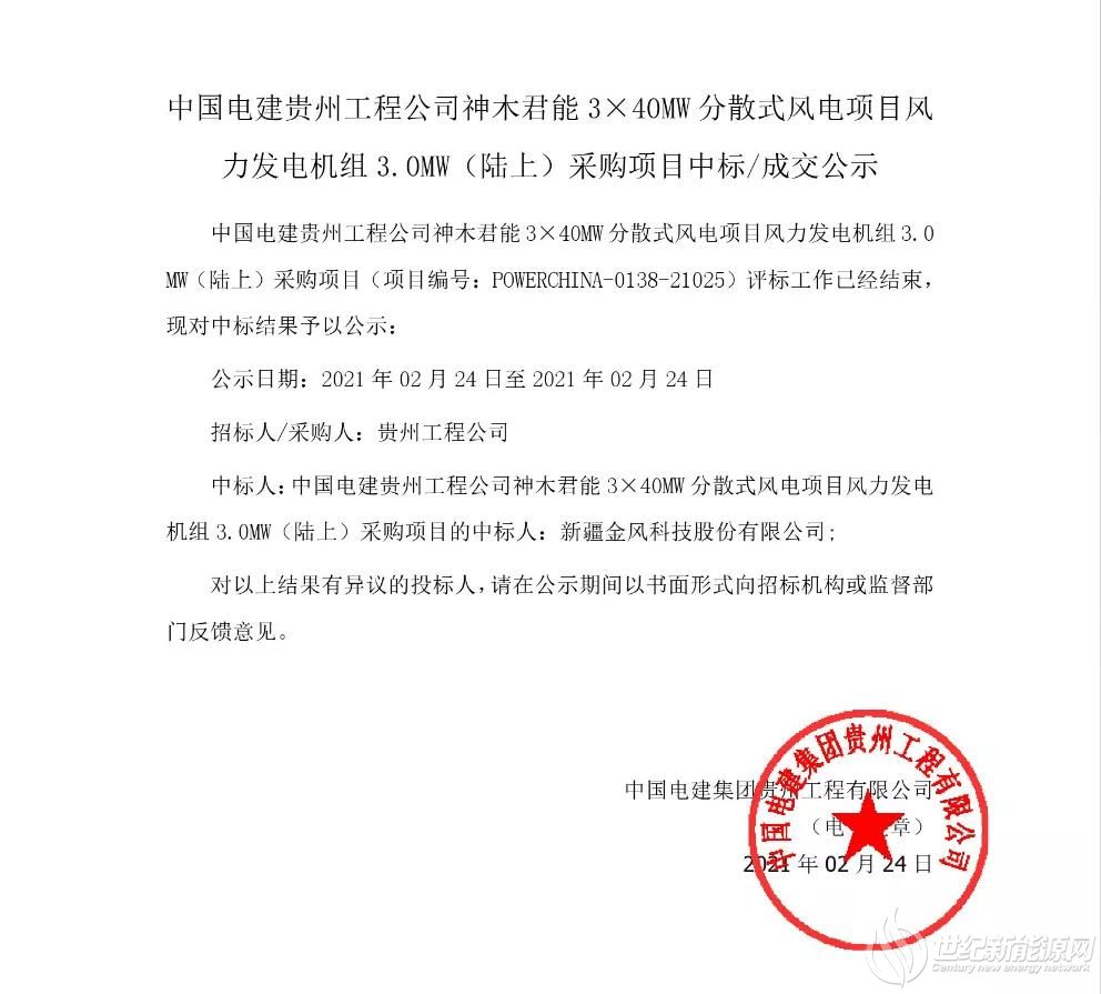 2月24日,中国电建发布神木君能3X40MW分散式风电项目风电机组3.0MW(陆上)采购项目中标/成交公示。