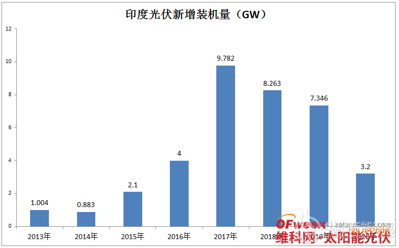 早在2015年,印度政府就制定了关于光伏项目建设的宏伟目标,要在2022年实现光伏总装机量100GW,其中公共事业级地面光伏60GW,屋顶光伏40GW。在随后的2016和2017年,印度光伏新增装机量确实连年上涨,一度成为了仅次于中美的第三大光伏市场,并吸引了很多光伏企业的关注,甚至在当地建设了工厂。