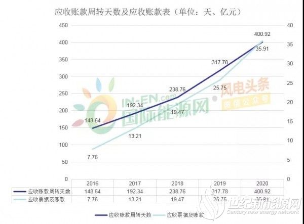 财报数据显示,虽然节能风电账面营收能力有所提高,但实际上企业入账金额表现不佳。财报数据显示,企业经营活动产生的现金流量净额为13.97亿元,同比减少11.23%。2020年,节能风电应收票据及应收账款为35.91亿元,同比增长10.16亿元;应收账款周转天数为400.92天,同比增长83.14天;两项数据均在逐年增长,反映出企业账款回收遇到了困难。