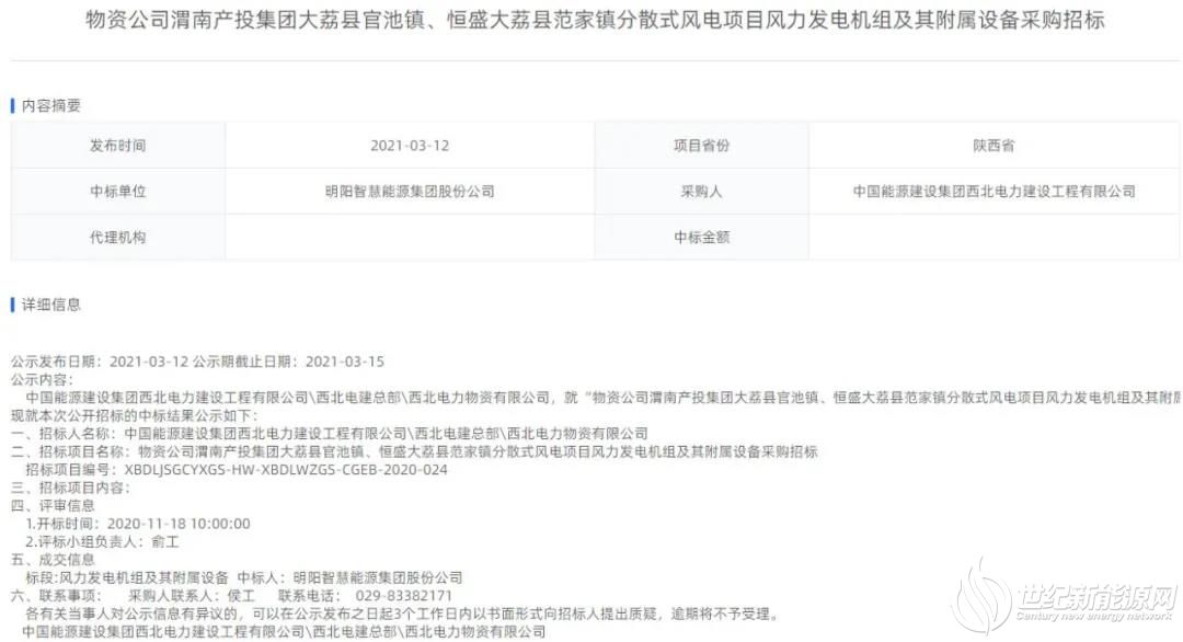 3月12日,中国能建西北电建公布渭南产投集团大荔县官池镇、恒盛大荔县范家镇分散式风电项目风电机组中标人,明阳智能中标。