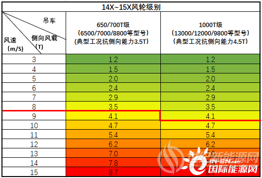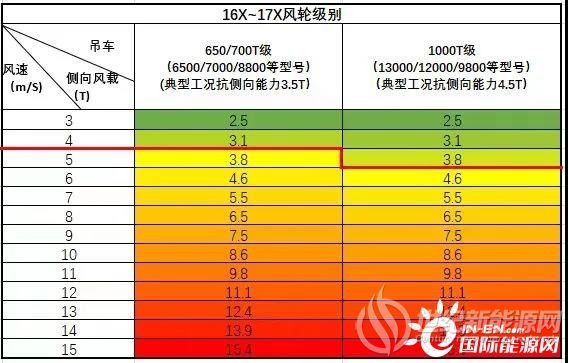 注意:如果吊装16X~17X风轮级别,选用650/700T级吊车,临界风速4米/秒工况,是安全绿区;当风速升至5米/秒,就超出了吊车3.5T的抗侧向能力。这时,瞬间的风速升高,就可能导致事故发生。