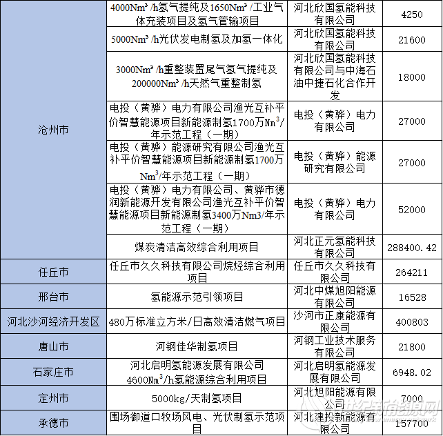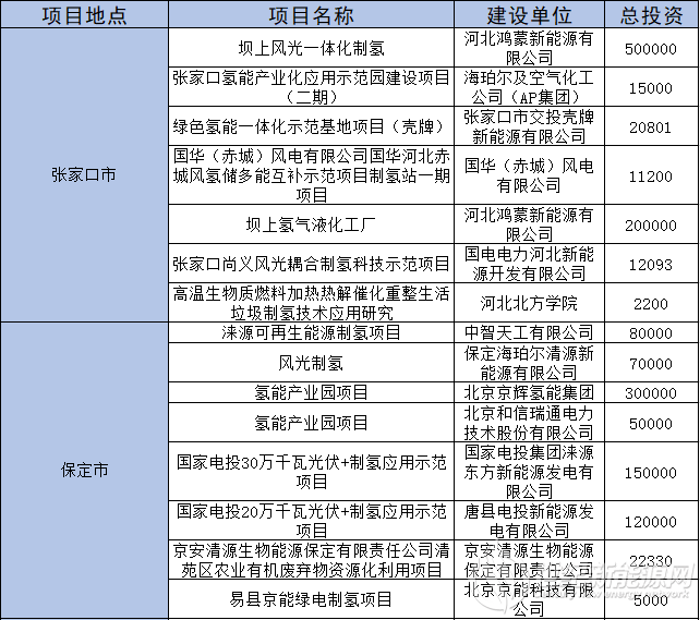 根据公示的信息,本批次涉及的制氢项目共有29个,张家口市、保定市、沧州市等地均有分布,总投资2871784.44万元。其中超过半数的项目为可再生能源制氢,主要由壳牌、国电投等单位投资建设,其中进度最快的项目预计将于2021年12月建成投产。