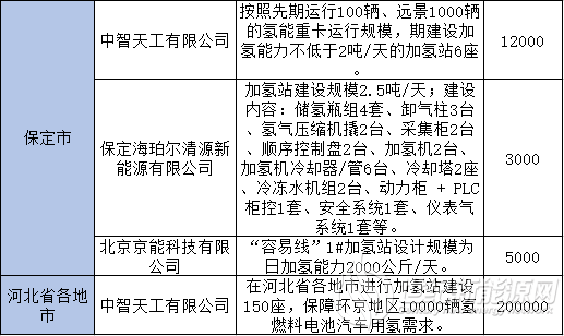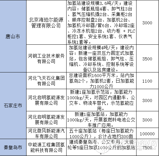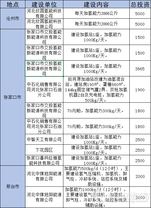 项目清单中列出的加氢站项目共24个,总投资375765万元。其中9个项目位于张家口市,为全省最多。此外,有19个加氢站规划的日加氢能力达到了1000kg及以上,并且大部分项目预计将于2021年底建成投产。