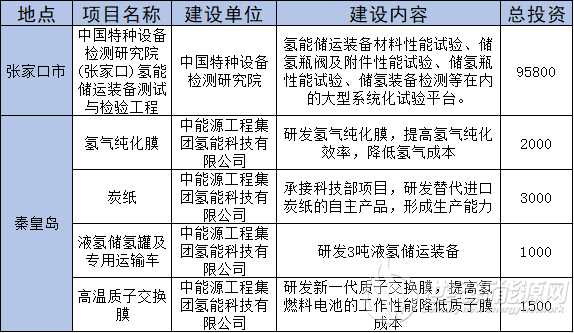 清单中共有5个技术研发类项目,总投资103300万元。其中4个项目由中氢科技在秦皇岛开展,主要涉及氢气纯化、储运、质子交换膜等技术。
