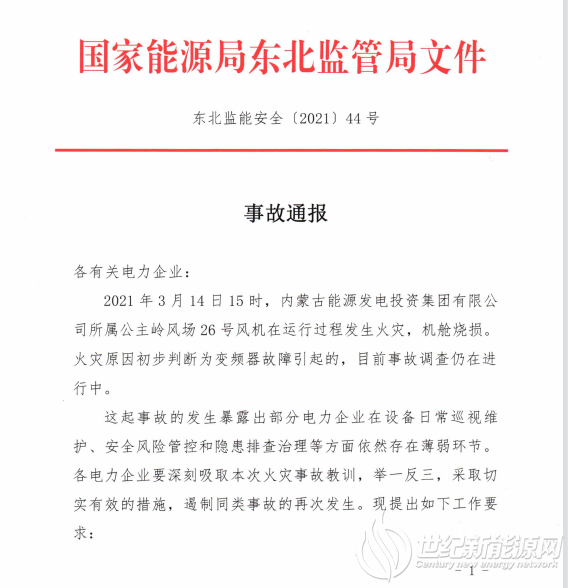 3月24日,国家能源局东北监管局发布《事故通报》,对3月14日内蒙古能源投资集团公主岭风电场26号风机机舱烧损事故做出初步回应:该事故火灾原因初步判断为变频器故障引起,事故调查仍在进行中。