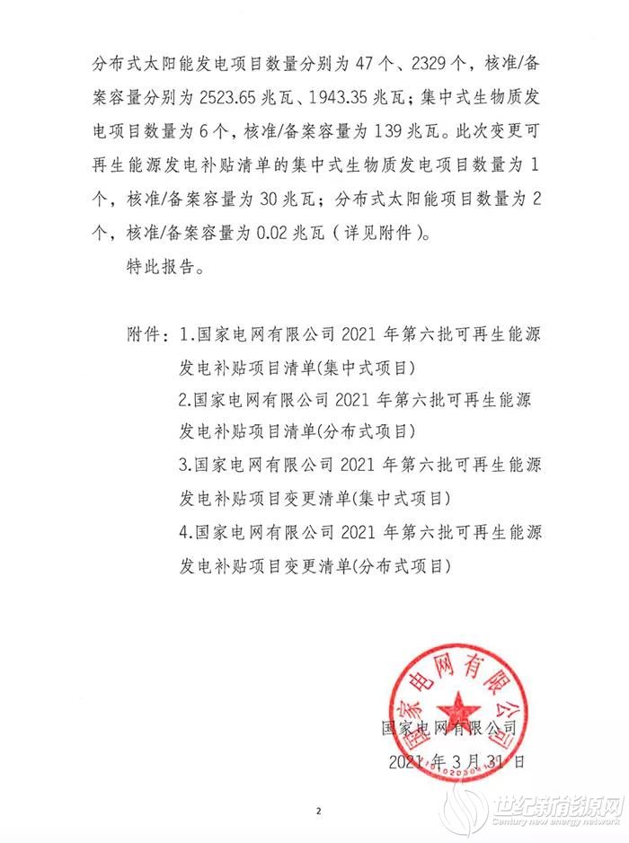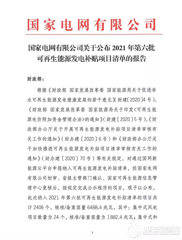关于公布2021年第六批可再生能源发电补贴项目清单的公告