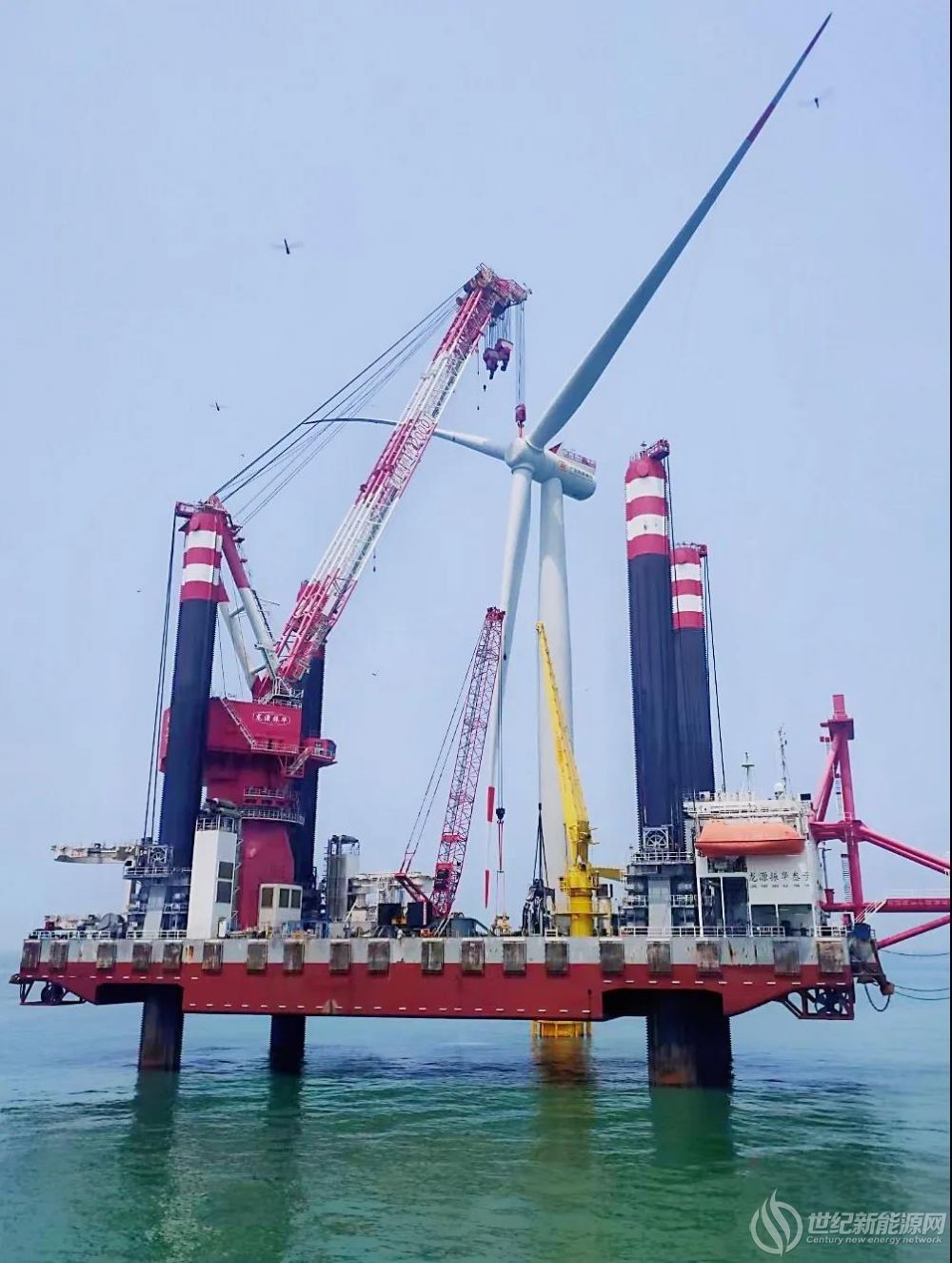 本次吊装的首台风机为上海电气6.25MW机型,风机高约108米,叶片长约83米,由公司“龙源振华叁号”海上施工平台作为主吊船。