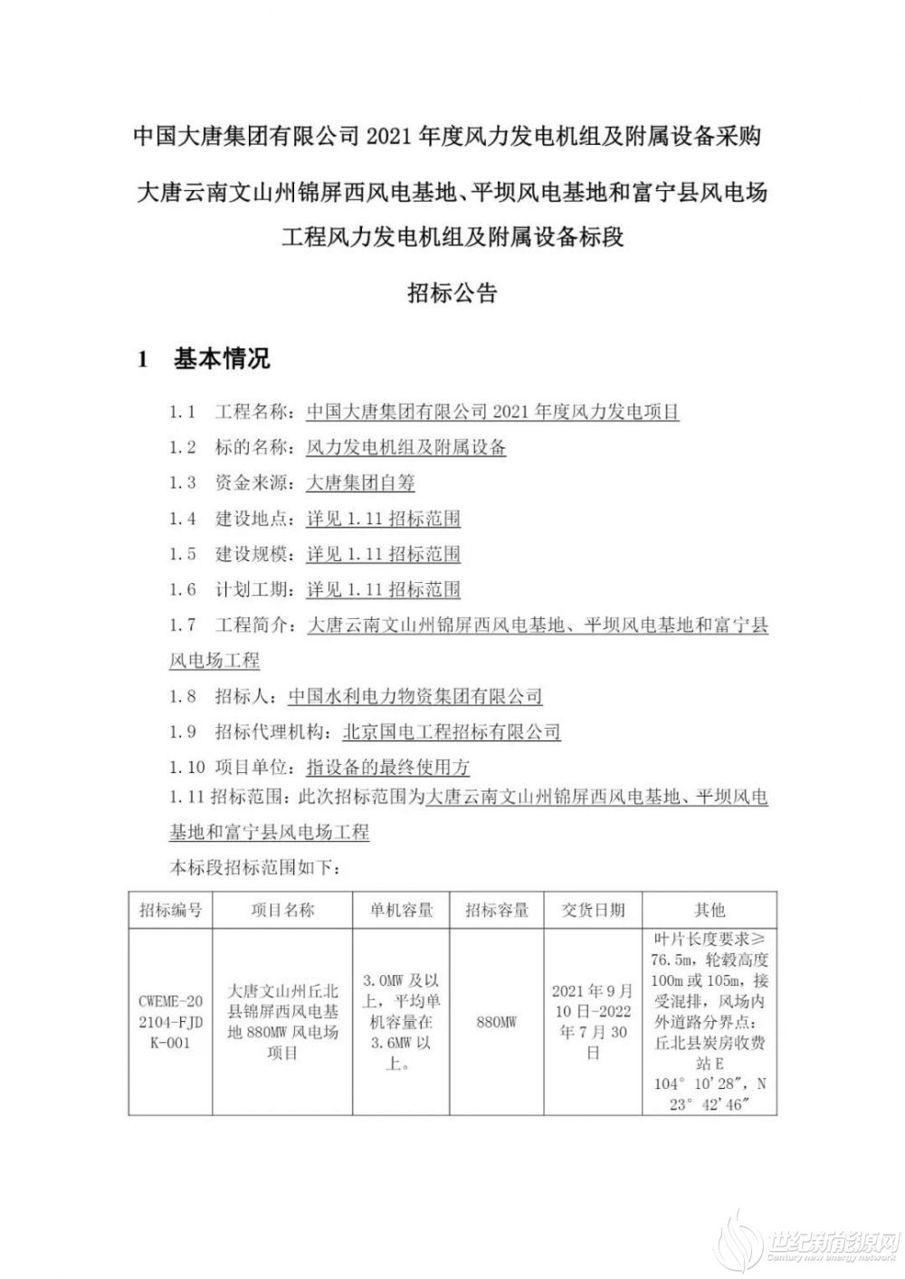 4月1日,大唐集团发布大唐云南文山州锦屏西风电基地、平坝风电基地和富宁县风电场工程风电机组采购招标公告,共6个风电项目,规模共计1980MW。要求:单机容量3.0MW及以上,平均单机容量在3.6MW及以上。
